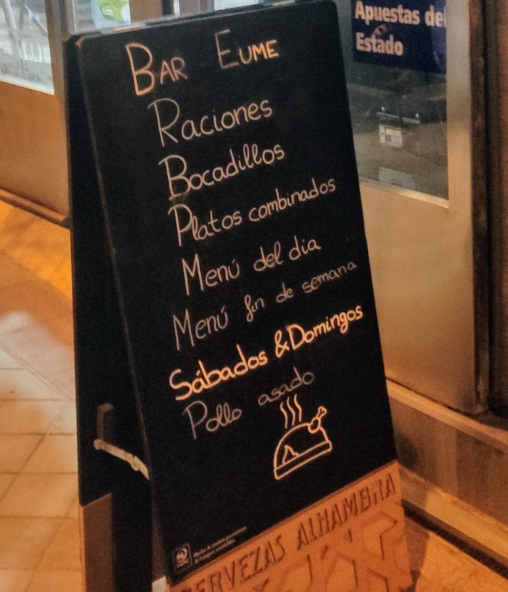 In conclusion, Cafeteria Eume presents a menu that feels both comforting and satisfying, with a clear emphasis on hearty, traditional flavors that deliver consistent quality. Dishes like Pollo Para Llevar stand out for their convenience and well-seasoned preparation, while the Costillas offer a richer, more indulgent option with tender meat and robust taste. The inclusion of classics such as Sopa de Cocido highlights the restaurant’s connection to homestyle Spanish cooking, providing a warm and flavorful experience that feels authentic and fulfilling. Meanwhile, sides like Patatas Acompañamiento Pollo complement the main dishes perfectly, adding balance and texture to the meal. Altogether, the menu reflects a straightforward yet thoughtfully curated selection that prioritizes taste, value, and familiarity, making Cafeteria Eume a reliable choice for those seeking satisfying, no-frills dining.